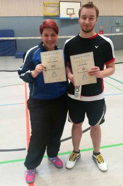 Janine Kneib erreichte bei Ihrem letzten Meisterschaftsspiel der vergangenen Saison die Stolze Anzahl von 200 Meisterschaftsspielen. Bis dahin ist es noch ein langer Weg für Jan Stobbe, aber auch er hatte bereits 50 Einsätze für die Badmintonabteilung des SCW.