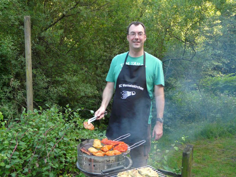 Die Attraktion des Abends war dabei natürlich Grillmaster Stefan Frieg, der in seiner neuen, sozusagen handgefertigten GdBAdSCW-Schürze zur absoluten Höchstform auflief.