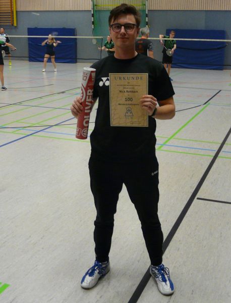 Beim Meisterschaftsspiel der SG Wermelskirchen/Wipperfürth 2 gegen den BC Burscheid 2 am 09.02.2019 wurde Nick Rehbach für 100 Meisterschaftsspiele geehrt. Hierzu gratulieren wir Nick ganz herzlich.