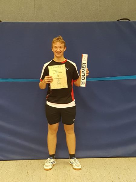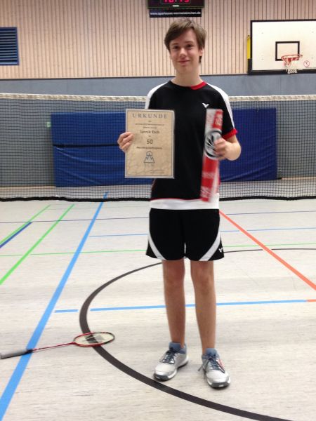 Am 9. Spieltag in der Saison 2011/12 trat der 12-jährige Jan Ebinghaus erstmals in einem Badminton-Meisterschaftsspiel für den Ski-Club Wermelskirchen an. Inzwischen hat er 50 Meisterschaftsspiele absolviert. Dafür wurde er beim Training am 05.10.2018 geehrt.