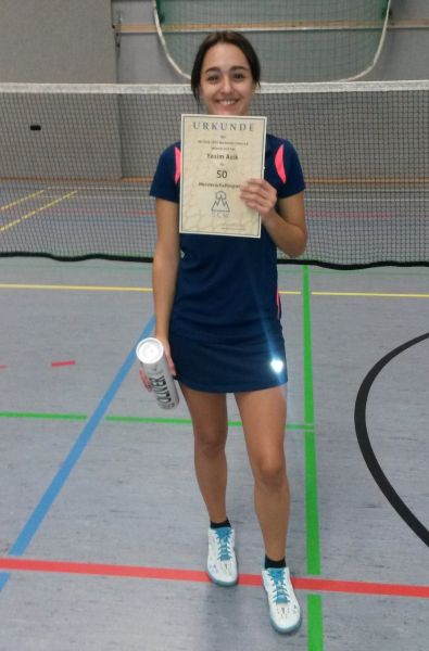Am 31.08.2012 trat die 11-jährige Yesim Asik zu ihrem ersten Meisterschaftsspiel in einer Mannschaft u.a. mit Rick Wagener an. Ein 5:1-Sieg gegen Witzhelden war das Ergebnis, wobei Yesim für den Ehrenpunkt der Gäste sorgte. Inzwischen gehört Yesim zu den stärksten Damen in unserem Verein und spielt sehr erfolgreich im O19-Bereich. Wir gratulieren Yesim zum 50. Meisterschaftsspiel.