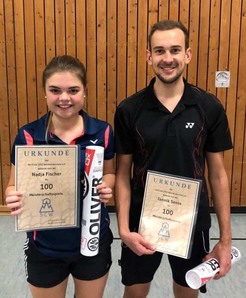 Beim Meisterschaftsspiel gegen Bergfried Leverkusen am 21.11.2018 absolvierten unsere beiden noch jungen, aber bereits sehr erfahrenen Trainer Nadja Fischer und Jannik Senss jeweils ihr 100. Meisterschaftsspiel. Wir sind stolz darauf, so engagierte junge Leute, die viel Zeit und Arbeit in den Verein einbringen, und dennoch den Spaß an der Sache nie verlieren, bei uns zu haben. Wir gratulieren ganz herzlich!