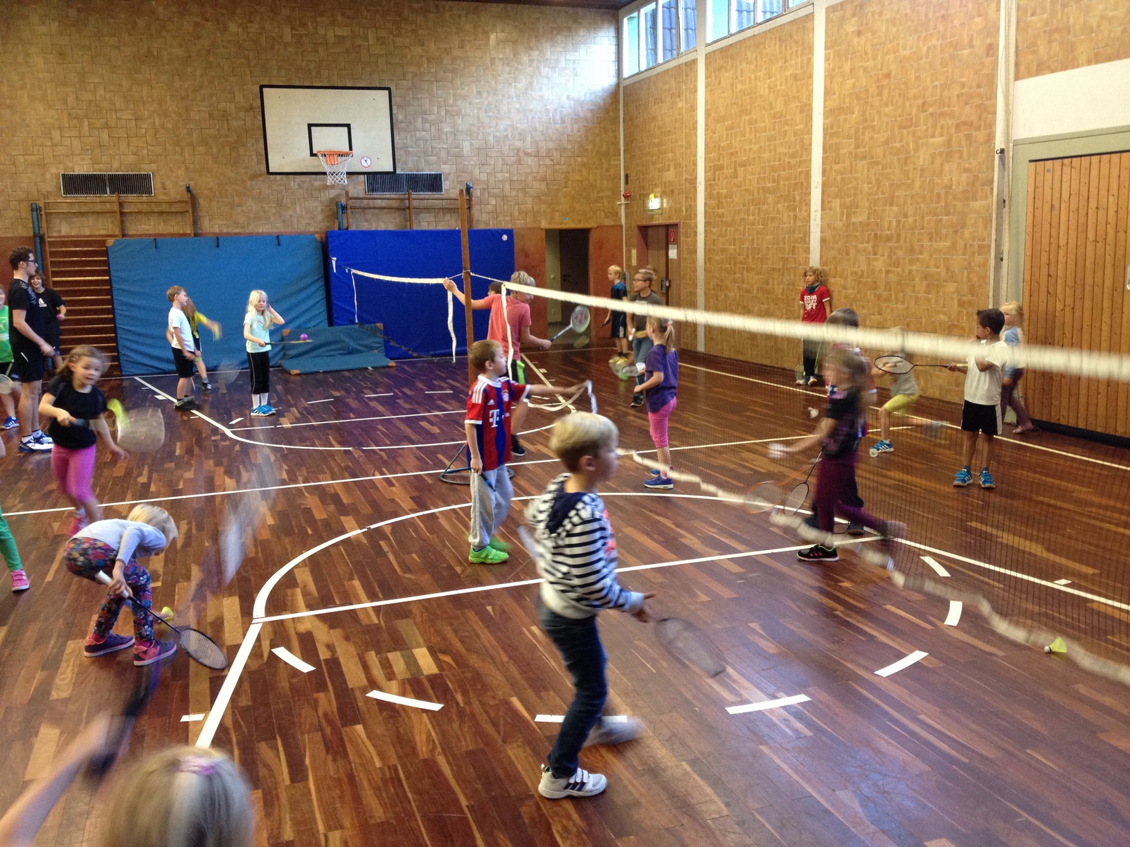 Dann ging es heute morgen los. Erst ein kleines Aufwärmspiel, dann erste Ballgewöhnungsübungen. Dafür, dass einige Kinder zuvor noch kein Badminton gespielt haben, hat dies schon erstaunlich gut geklappt. Nach einer kurzen Pause wurden erste Übungen mit Schlägen über das Netz vorgenommen. Unsere jungen Vereinsmitglieder standen dabei immer mit Rat und Tat zur Seite. Daraufhin ein kleiner Rundlauf mit den Grundschülern.