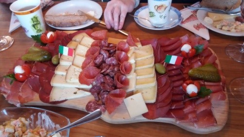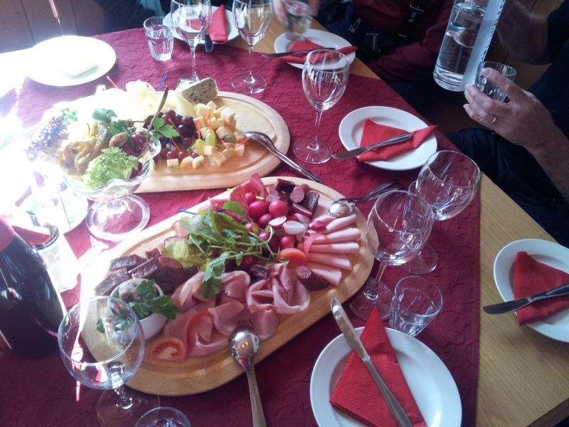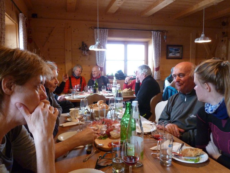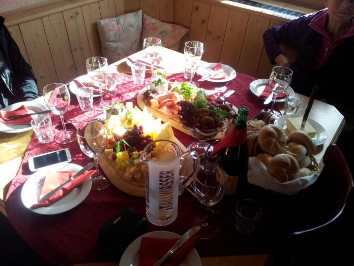 Traditionell wurde am Mittwoch das Bergfest auf der Troierhütte gefeiert. Bruno, der Gastwirt, hatte wieder reichhaltige, sehr leckere Speck- und Käseplatten serviert. Dazu gab es wie immer einen guten Rotwein. Das gemütliche Beisammensein ist jedes Mal ein Höhepunkt der Woche.