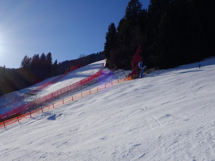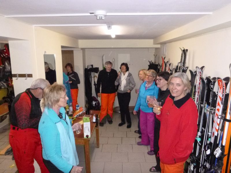 Da unser WSV-Lehrer Thilo erst am nächsten Tag zu uns stoßen sollte, sammelten wir die erste Fahrpraxis, um uns nicht allzu desolat zu präsentieren. Im Skigebiet fanden wir dabei sehr gute Pistenverhältnisse vor, obwohl insgesamt recht wenig Schnee lag. Zum Abschluss des schönen Skitages war die Abfahrt bis direkt zum Hotel gerade noch möglich. Ungewohnt war im Skikeller die akkurate Einsortierung für Schuhe und Ski nach jeweiligen Zimmernummern, bevor es dann mit der Nachmittagsjause zum gemütlichen Teil des Tages überging.