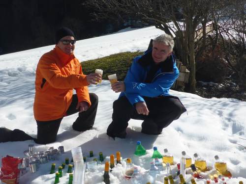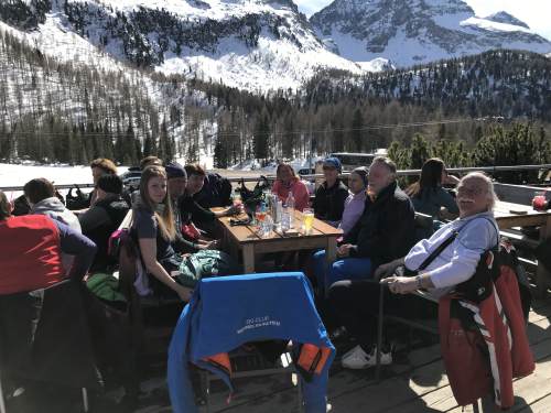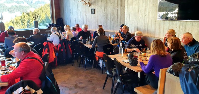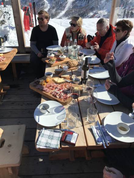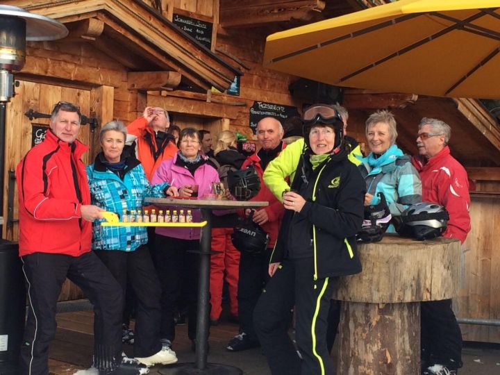 Damit ist das breite Spektrum der Fahrt jedoch noch nicht erzählt: Auch zwischen Skifahren und dem Vier-Gang-Menü haben wir Programm genossen, Jeder und Jede nach der gewünschten Façon: in der Sauna, dem Whirlpool, auf der Terrasse mit einem Kaltgetränk aus der Dose oder an der Bar mit einem Aperitif im Glas. Beim Bergfest (dieses Jahr in der Deluxe-Variante, siehe Foto) hat die Fahrtenleitung sich flexibel gezeigt und es auf Wunsch der Gruppe auf eine Hütte an der Piste verlegt, sodass bei Rotwein und anderen kulinarischen Köstlichkeiten die Stunden verflogen sind.