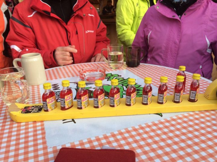 Essen war ein zentrales Thema. Nicht nur im Hotel oder beim Bergfest, sondern auch der nachmittägliche Einkehrschwung auf der Rodellahütte gehörte, nachdem die Ersten den Kaiserschmarrn genossen hatten, zum festen Ritual. Dazu einen Pflaumenlikör und die Stimmung stieg.
