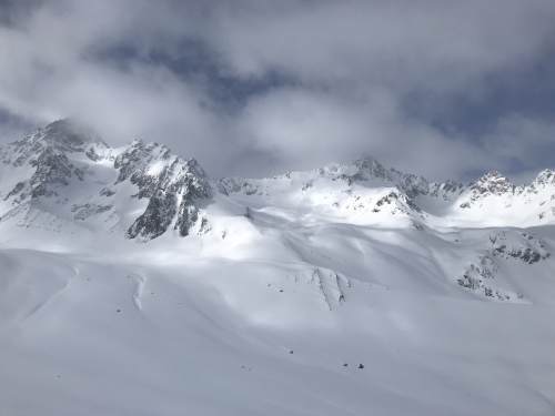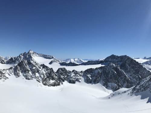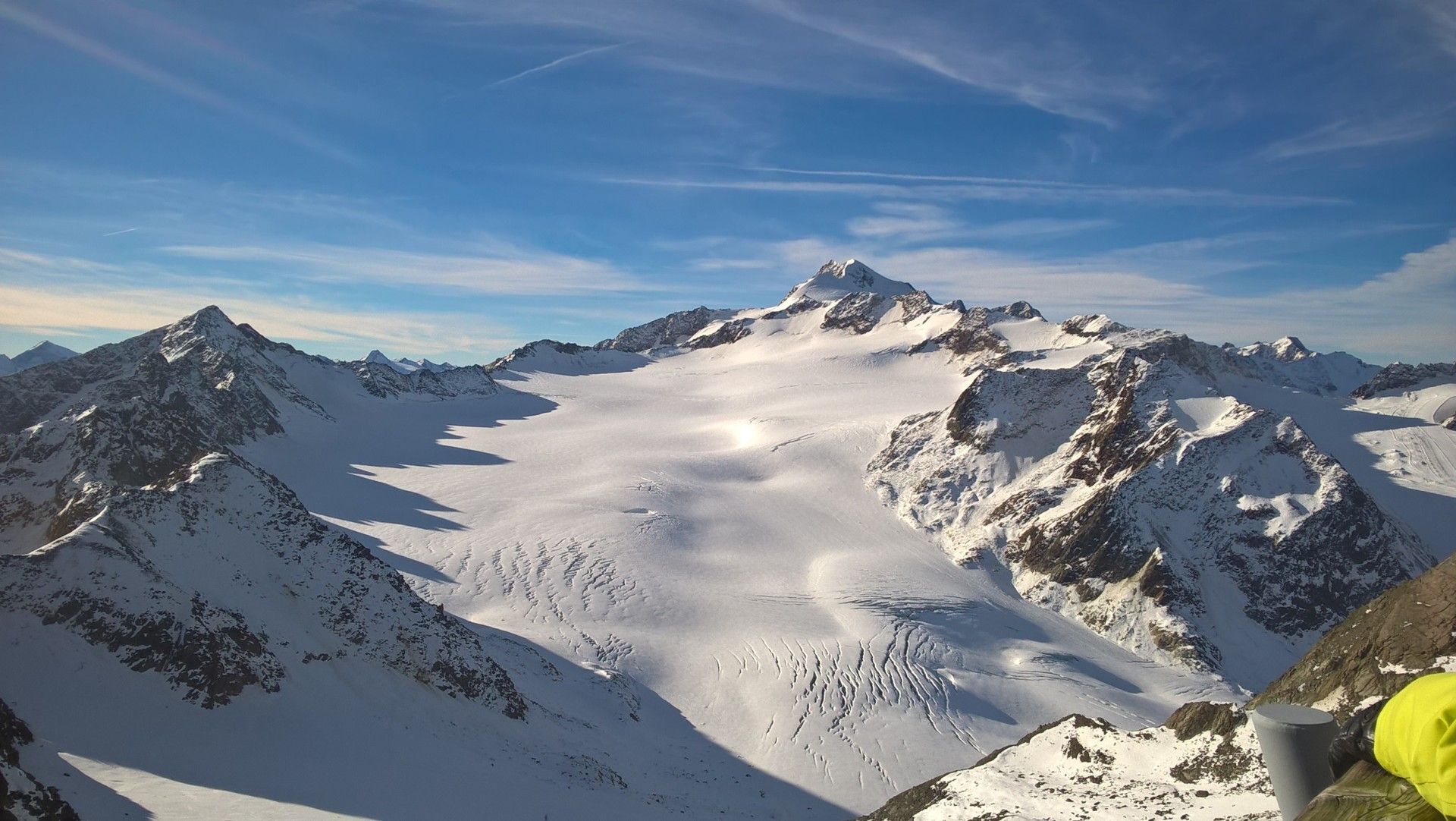 Der zweite Ausflug verlangte (mentale) Stärke ab, Aufstiegszeit 4h zum hinteren Seelenkogel, morgens hart gefroren, mit Aufgang der Sonne wurde es ordentlich warm. Das Stapfen, Spitzkehre für Spitzkehre durch ein einsames Tal, war eine schweißtreibende Angelegenheit und wurde mit einem Gipfelerlebnis und Pulverschnee (Mitte April, auf 3470 m Seehöhe) im oberen Teil der Abfahrt belohnt. Dann weite aufgefirnte Gletscherflächen - ach Skifahrerherz, was willst Du mehr. Der „Abstieg“ vom Gletscher weniger nice und herausfordernd, mit Erreichen der Schönwieshütte kurzes Auftanken und dann nochmal eine Stunde Anstieg zurück zur Hütte. Puh.