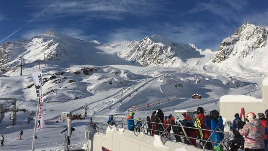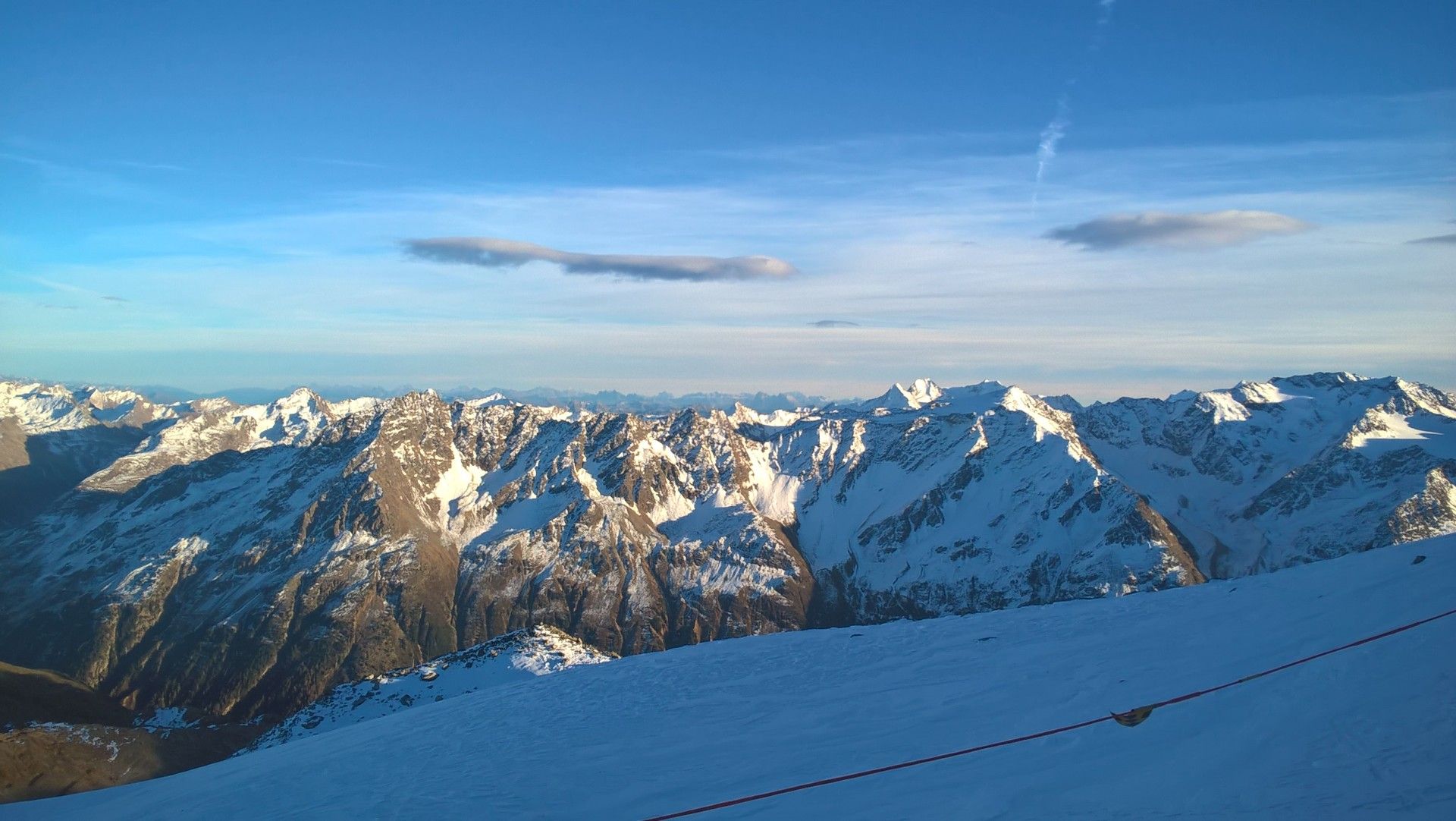 Am Donnerstag konnte es endlich losgehen. Noch ohne Trainer aber mit „Skischulleitung“ Stefan ging es entspannt zum Einfahren. Mit einer Truppe von 4 Skilehrern und 4 „Touristen“ erkundeten wir das Gebiet und genossen bei traumhaftem Wetter den Blick zu den Dolomiten wo die diesjährige Osterfamilienfahrt stattfand und ins Pitztal wo es 2017 hingehen wird. Nach einem „Leiter-Sturz“, den ich hier aber nicht weiter erwähnen möchte, wurde mittags an der Rotkogel-Hütte eingekehrt.