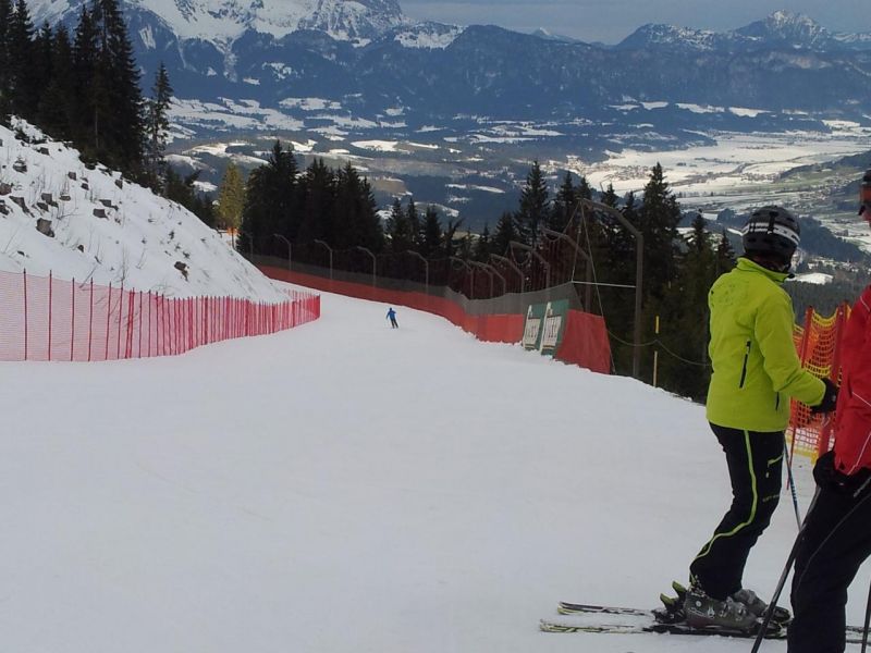 Highlight war natürlich das Skilaufen auf der legendären „Streif“ in Kitzbühel, der „Mutter“ aller Abfahrtsrennen. Da das Rennen 1 Woche später stattfand, konnten wir die Aufbauarbeiten hautnah miterleben. Wer einmal am Starthäuschen steht und auf die Piste blickt, erahnt, was da auf einen zukommt. Wo wir mit gepflegten Bögelchen versuchten, die Strecke mit einigermaßen Anstand und Würde zu bewältigen, sollten sich eine Woche später ein paar Waghalsige ins Tal hinab stürzen.