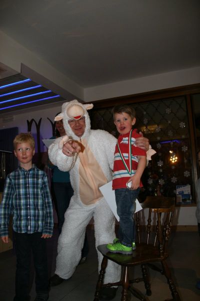 Das Ergebnis des Skitrainings zeigte sich dann auch am Tag des Kinderskirennens. Die Kinder hatten alle tolle Fortschritte gemacht und fuhren mit viel Spaß das Slalomrennen mit. Abends wurden die Medaillen von einem als Schaf verkleideten Leiter überreicht. Man sieht hier, wieviel Spaß und Engagement die Skilehrer und anderen Cluboffiziellen mitbrachten.
