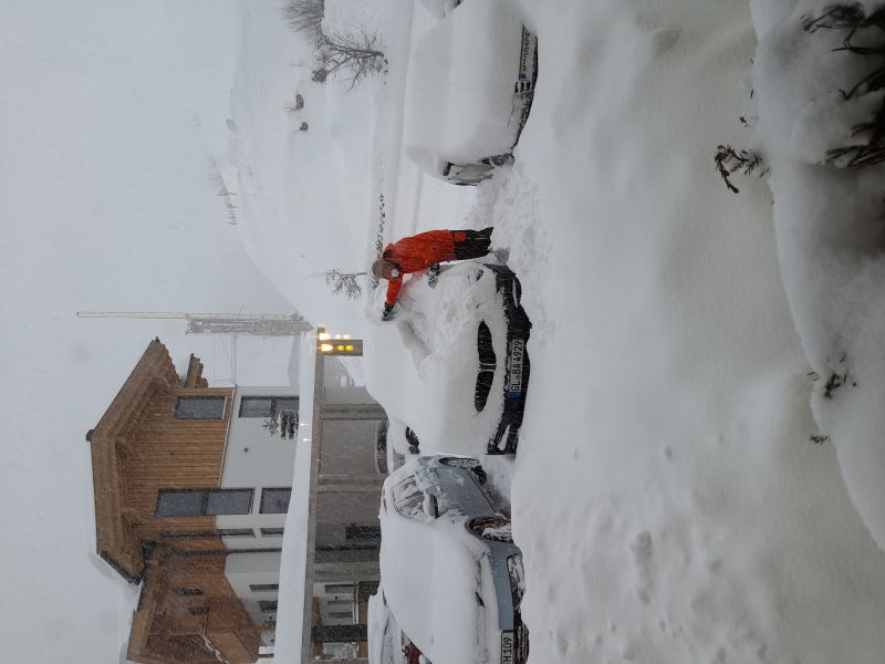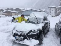 Damit uns der Abschied nicht allzu hart ankam, zeigte das Wetter am letzten Tag, dass es in den Bergen auch noch Anderes kann als Sonne: Schnee und Wind ließen gegen Mittag auch die Letzten ins Hotel flüchten. Nachmittags hieß es dann: Autos ausgraben.