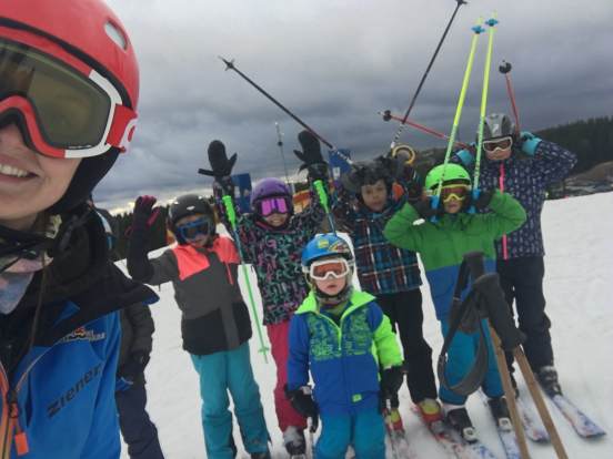 Selbst im Tal am "Anfängerhang", dem Dorflift, konnte Marei mit unseren kleinsten Teilnehmern noch die ersten Schwünge und das Liftfahren üben. Zuschauende Väter genossen dieses übrigens auch - vermutlich wegen der tollen Versorgung mit Burgern, Pommes und Limonade.