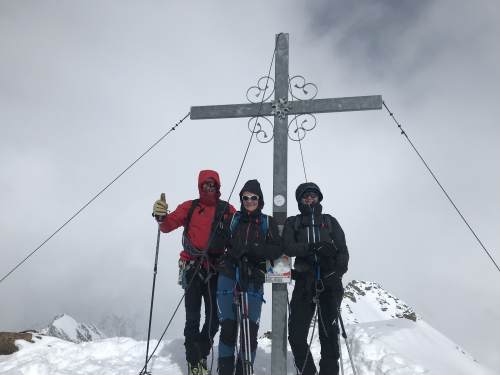 Nachmittags zurück auf der Hütte belohnten wir uns dann gerne mit Kaiserschmarrn oder Apfelstrudel und auch mal mit einem kurzen Nickerchen. Dank unseres Bergführers lernten wir auch bei dieser dritten Ski-Tour erneut eine Menge dazu, wie man beispielsweise unterhalb des Gipfels ein Ski Depot anlegt, um die letzten Meter am Seil in Skischuhen zum Gipfelkreuz zu klettern, oder er frischte unsere Kenntnisse über die alpinen Naturgefahren und unsere Sicherheitsausrüstung auf. Darüber hinaus lernten wir natürlich auch wieder einmal unsere eigenen konditionellen und skiläuferischen Grenzen kennen. Trotz aller Anstrengungen war es abermals eine beeindruckende und erlebnisreiche Woche…