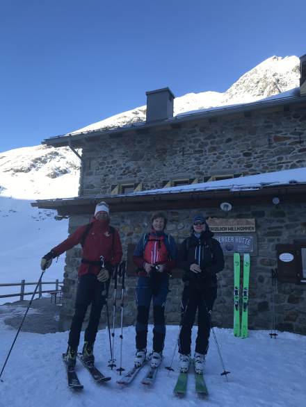 Die Langtalereckhütte liegt oberhalb von Obergurgl in den Ötztaler Alpen auf 2450 m Seehöhe. Von Obergurgl startend, stiegen wir mit unserer Leihausrüstung unter den Füßen zunächst im Skigebiet, dann bis zur Schönwieshütte und letztendlich zur Langtalereckhütte auf. Beziehen konnten wir drei ein feines Vierbettzimmer. Nach einem leckeren Abendessen ging es am nächsten Morgen zum ersten „Ausflug“ los, immer noch bergauf. Über die Fahreigenschaften unseres Leihmaterials gab es noch keinerlei Erkenntnisse, wir übten wieder Spitzkehren und bezwangen am Ende einen ca. 35 Grad steilen Hang zu einer Scharte, von der aus wir uns dann weiter zu Fuß aufmachten, den Gipfel des vorderen Seelenkogels zu erklimmen, leider ohne Gipfelkreuz. Luftige Angelegenheit ! Für die Stärkungspause schaufelte Alex mit der Lawinenschaufel eine „ Bank “ in den Hang; von diesem Ausguck eröffnete sich ein großartiges Panorama, die Beine konnten Kräfte sammeln und später diente die waagrechte Fläche jedem zum Anschnallen der Ski. Aha! So geht das!!! Im Steilhang testeten wir dann auch mal die Fahreigenschaften unserer Ski, schön geht anders, aber herausfordernd und spaßig definitiv so! Mit viel Grinsen im Gesicht kamen wir dann vom ersten Ausflug auf der Hütte an und stärkten uns beim wiederum richtig leckeren Abendessen.