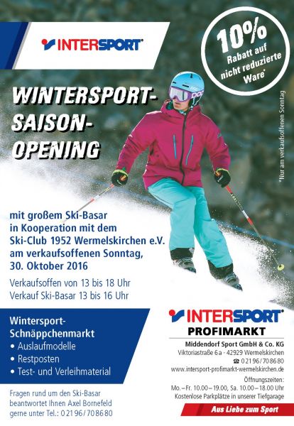 Am verkaufsoffenen Sonntag, 26. Oktober 2025 („A la Carte“) veranstaltet der Ski-Club seinen traditionellen Ski- und Snowboard-Basar in der Tiefgarage von Intersport Middendorf in der Viktoriastraße in Wermelskirchen.