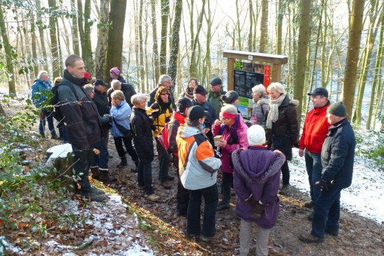 An einer Info-Tafel, die Grenzen im Mittelalter darstellt, legen wir die erste Rast ein, um uns an den mitgebrachten „Weihnachtsplätzchen“ zu laben.