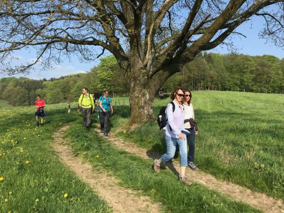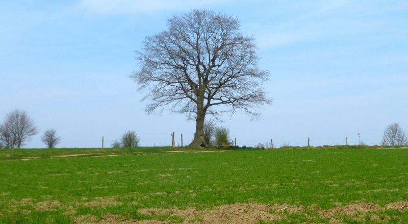 Vom Uelfebad ging es durch den Wald hinauf auf die Felder, vorbei an einer kleinen Ortschaft, dann wieder steil hinunter zum Eistringhauser Bach. Glücklicherweise führte der Bach wenig Wasser, sodass wir über einige große Steine trocken auf die andere Seite kamen. Von dort ging es dann wieder steil hinauf bis auf die Felder nahe Herkingrade. Nach einer kleinen Rast bei der großen Eiche ...