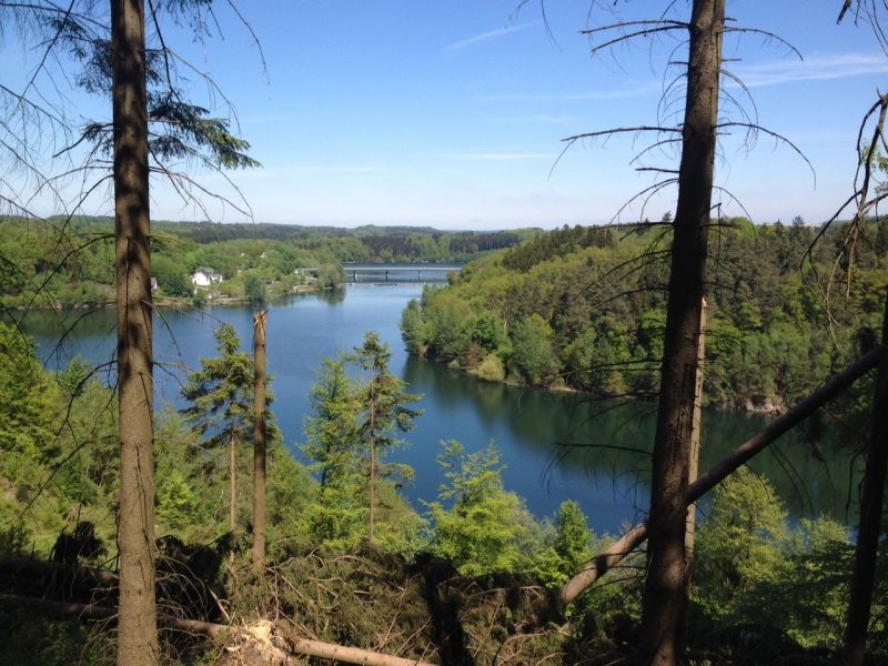 Entlang der Talsperre genossen wir die herrlichen Ausblicke, dann bogen wir ab, um nach Brachhausen zu kommen. An der T-Kreuzung, an welcher der Ausgangspunkt des Sengbach-Talsperren-Laufes ist, pausierten wir erneut, einige Freunde fuhren von hier aus mit dem Auto zum Restaurant.