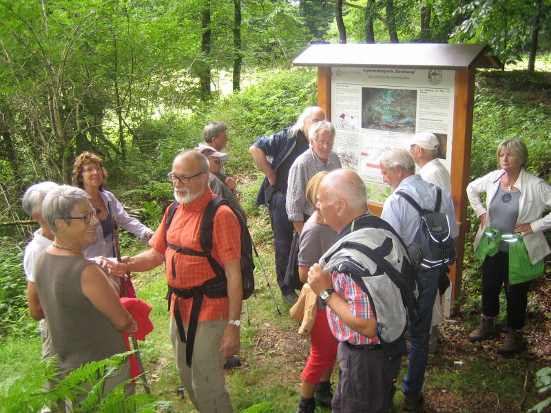 Im Ort angekommen informierte uns eine große Wandertafel darüber, dass in den vergangenen mehr als hundert Jahren hier im Ort Kupfer abgebaut worden war, erst nahe der Erdoberfläche im sogenannten "Ackerzug", dann immer tiefer im Danielszug, in den auch der Hauptschacht mündete.