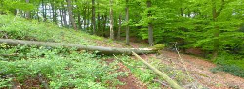 Von dort an ging es erst einmal bergauf, bergauf. Durch die Bäume konnten wir einen Blick auf „Haus Hammerstein“ werfen, aber das liegt auf der anderen Seite der Wuppersperre. Oben angekommen wanderten wir weiter über Karrenstein, vorbei an Mittelhombrechen nach Oberhombrechen. Von Ferne konnten wir das örtliche Windrad geniessen, aber dann wurde es etwas schwieriger, über die Schafswiese, durch den Zaun und in den Wald, der Weg war kaum zu sehen. Dort versperrte uns eine riesige Buche den Weg, aber mit Geschick überwanden wir auch diese.