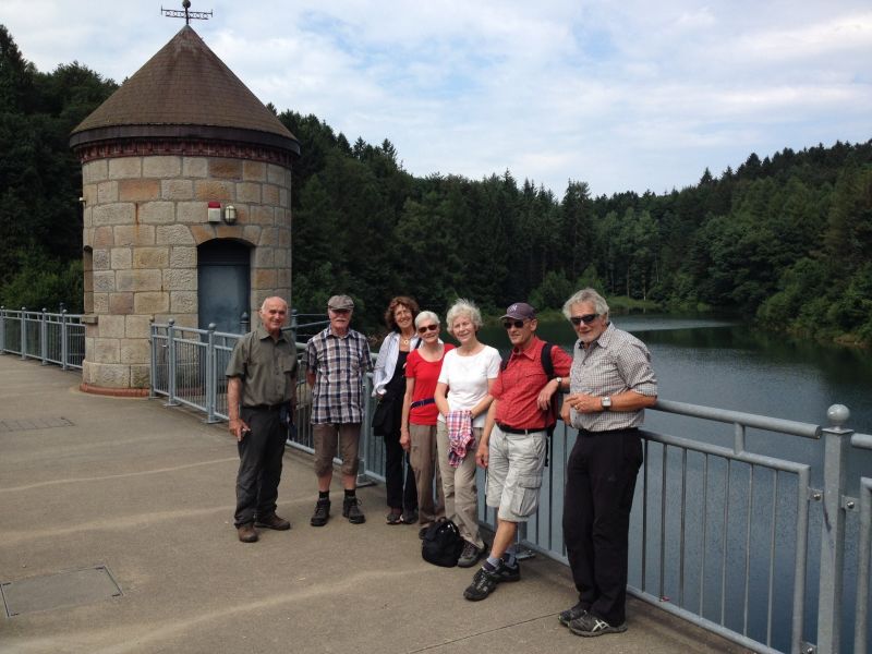 Los ging es in Richtung Käshammer, immer an der Gelpe entlang. Kurz vor dem Gelper Hof wählte Ulla Schwinghammer einen anderen Weg, sie wollte nicht ganz so weit laufen. Wir anderen aber wanderten weiter durch das Gelpetal bis zu einer alten Fabrik, von der nur noch der Schornstein übrig war. Dann ging es hinauf in Richtung Ronsdorf bis auf die Höhe bei Holthausen. Vorbei an der Klinik „Bergisch Land“ führte unsere Wanderung in Richtung Ronsdorfer Talsperre. Dort machten wir eine kurze Rast und fanden auch jemanden, der uns auf der Sperrmauer fotografierte.