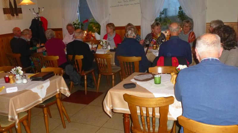 Dort wurden wir schon erwartet, einige Tische waren sehr schön für uns dekoriert worden. Bei Kaffee, Kuchen und Herzhaftem, sowie hervorragenden Waffeln, mit Kirschen, Sahne und Eis ließen wir es uns gut gehen und erzählten über die erlebte Wanderung, die uns allen infolge der „frischen Luft“ nach den Feiertagen besonders gut getan hatte.